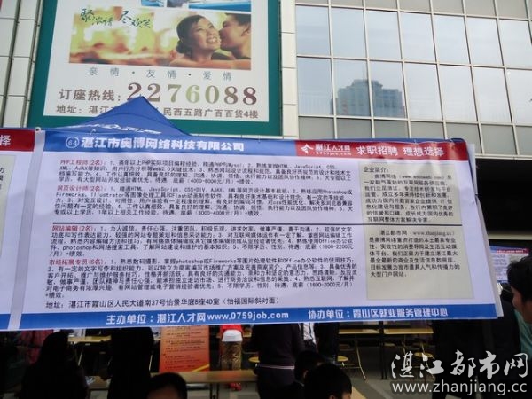 今天上午9点,湛江市大型现场招聘会在霞山人民大道南的广百南门广场举办,湛江地区100家企业参加了现场招聘会,盛况空前,吸引了众多求职者踊跃参加。我司借此机会,诚聘英才,广邀具有相关技术实力且诚信、务实、宽忍、执著、拼搏的行业精英加盟,为我司团队扩充和业务发展奠定基础。