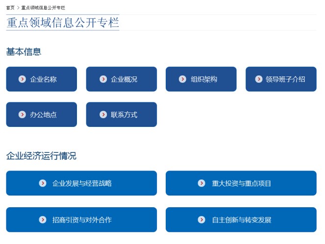 市属企业在各自企业网站首页设置“重点领域信息公开专栏”,专栏内容包括:企业名称、企业概况、组织架构、领导班子、办公地点、联系方式、企业运行情况等基本信息。