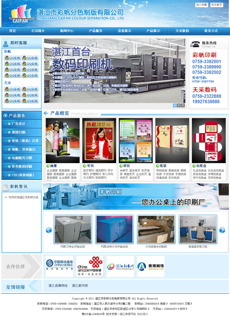 湛江彩帆分色制版有限公司是粤西地区一间专业印前技术公司。主要从事高精度扫描、输出、传统打样、数码打样、数码快印、电脑激光刀模、CTP直接制版等业务,提供印前一站式服务,网络涉及湛江、粤西地区及广西地区。公司成立于1996年,一直在专业传统制版技术及设备配套的基础上,对原有的设备进行升级改造,新购及更新部分设备。