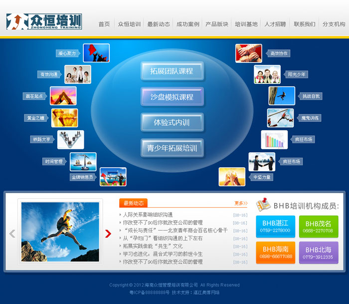 海南众恒管理培训有限公司经营管理是海南体验式培训和商务活动领域的先驱者之一,凭借务实稳健的作风,发展至今。隶属BHB培训机构成员之一,旗下已形成广东步天下、广西八达、海南众恒三大运营中心,拥有天涯户外、步天下、八达、众恒培训、猎鹰CS等区域领导品牌,自建和合作开发了众多训练基地,在团队管理培训、拓展训练、户外旅行用品、户外运动俱乐部、自行车俱乐部...
