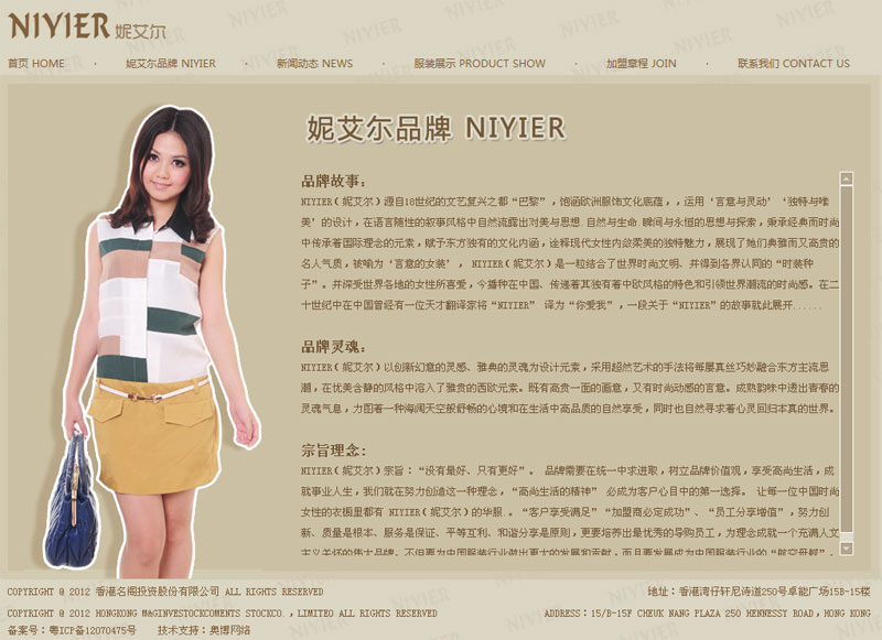 香港名阁投资股份有限公司总投资(一亿二千六百万)元人民币、并自主创立了( NIYIER妮艾尔)服装品牌,同时在中国市场开展以创意为旨、集设计、生产、销售、服务于一体的企业;公司以不断创新的经营理念,完善开发设计人才,强化专业的客户服务体系。