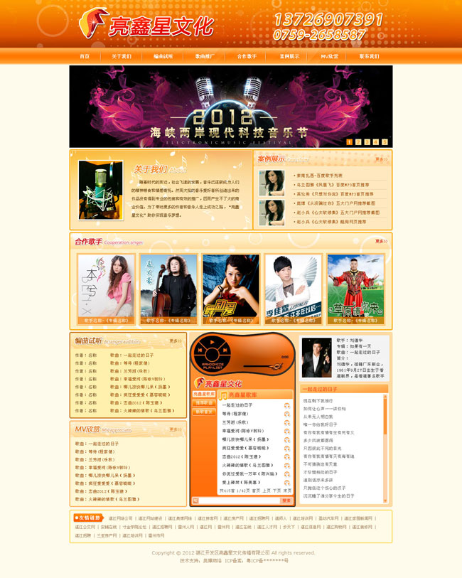 湛江亮鑫星文化传播有限公司是一个有着大量音乐制作、音乐宣传、音乐推广等专业人才的团队,是国内以及港澳台流行音乐的前沿阵地,集设计、出版、宣传、发行为一体的专业影音制作发行.经纪海内外各线明星, 模特、演艺嘉宾、歌手、舞蹈、模仿秀;新人包装推广、各类影视制作的娱乐经纪公司。
