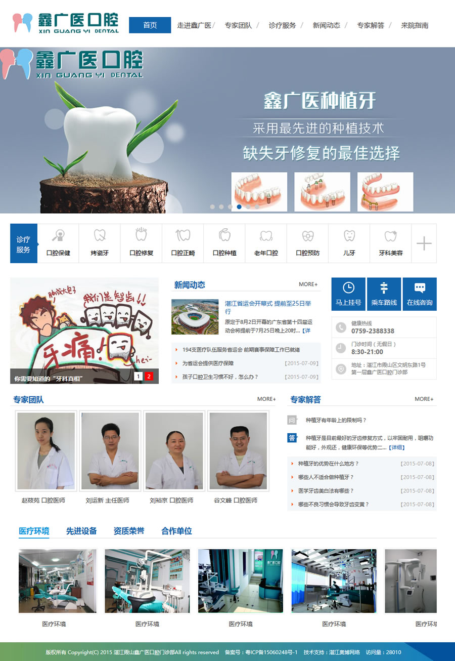 湛江霞山鑫广医口腔门诊部经湛江市霞山区卫生局审核发证,位于湛江市霞山区文明东路广东医学院正门斜对面,是广东医学院(中美)人本医学中心全新理念指导的专业口腔医疗服务单位,聘请德高望重的3.15口腔疑难病专家教授指导诊治。从2009年起是湛江市消委会首家口腔行业诚信单位,湛江市预防医学会、湛江市民营口腔协会、广东省民营口腔协会、广东省保健协会...