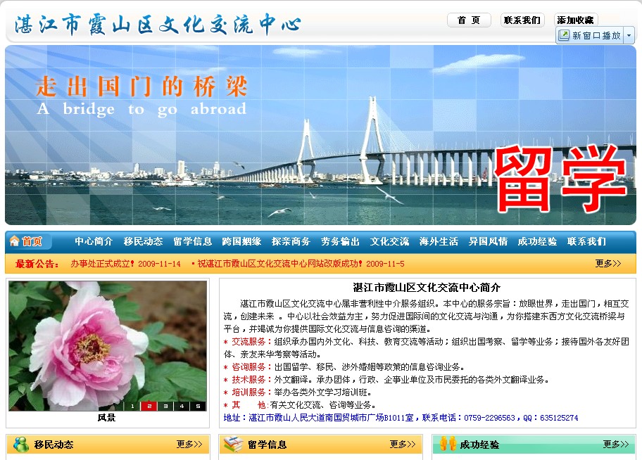 热烈庆祝我司于2009.11.5号完成湛江市霞山区文化交流中心网站改版工作,此次改版保留原有栏目和数据,在界面布局和SEO方面做了很大改进,后台管理更加方便简单。