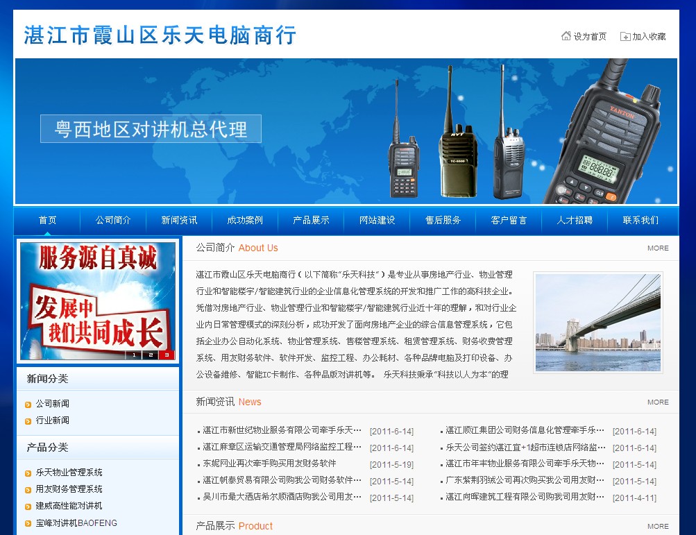 湛江市乐天科技有限公司(以下简称"乐天科技")是专业从事房地产行业、物业管理行业和智能楼宇/智能建筑行业的企业信息化管理系统的开发和推广工作的高科技企业。凭借对房地产行业、物业管理行业和智能楼宇/智能建筑行业近十年的理解,和对行业企业内日常管理模式的深刻分析,成功开发了面向房地产企业的综合信息管理系统,它包括企业办公自动化系统、物业管理系统、售楼管理系统、租赁管理系统、财务收费管理系统、用友财务软件、软件开发、监控工程、办公耗材、各种品牌电脑及打印设备、办公设备维修、智能IC卡制作、各种品版对讲机等。