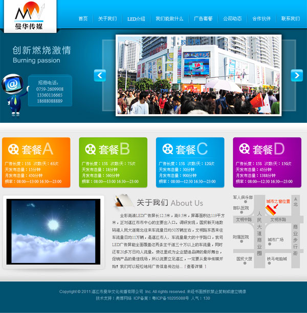湛江正式成立,是一家从事 LED 电子广告策划、宣传及发布的大型专业广告传媒公司。顶级的人才优势、前瞻的市场意识,是公司最大的优势。曼华传媒公司秉承“沟通、品质、创新、超越”的价值理念,以高端咨询和策划为主导、以专业广告设计和制作为支撑、以诚信经营和服务为助推,不断追求创新,将在