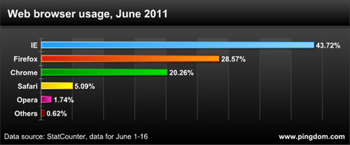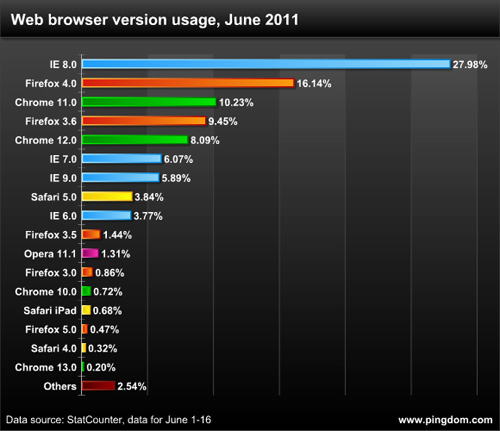 1、占主导地位的浏览器(也许你还没有使用):IE8.0仍然是目前世界上使用量最多的浏览器,远远超过其他浏览器。(译者注:这个也许在中国情况会不同,毕竟大部分景德镇人民喜欢IE6.0的哈!)