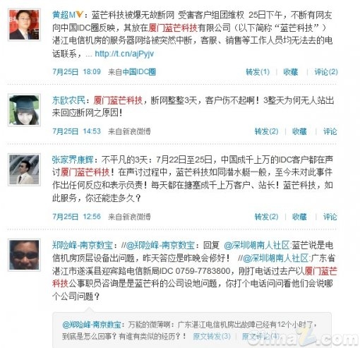众多网友对蓝芒此次事件的应对态度表示严重不满,蓝芒未能第一时间给客户一个真实准确的原因告知,并且客服渠道不畅通,导致很多客户连自己被断网的原因都无法了解,很多客户真诚的希望与蓝芒共同面对共同承担共同度过困难的诚心遭受伤害。据悉,26日蓝芒方面给出消息,湛江机房由于省电信逐个查资源,一周左右都没办法让服务器连通,蓝芒科技已将大部分机器转出运往厦门机房暂时上架,对部分没有被运回的服务器蓝芒将安排云主机暂时提供使用。对此,很多客户感到愕然,在没收到任何咨询意见的情况下,自己托管或租用的主机却被转移机房,部分客户表示不能接受,希望蓝芒方面尽快主动出面与客户友好协商解决,也有部分受害客户表示正准备向厦门、湛江两地消委会及工商管理部门进行投诉。
