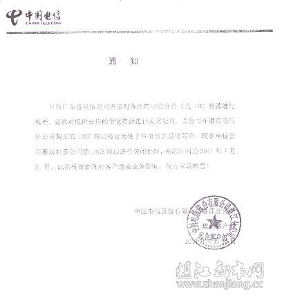 目前广东省电信公司开展对各地市电信分公司的IDC资源进行核查,要求对低价出售的带宽资源进行关闭处理。贵公司在湛江电信分公司购买的10GE端口被定为低于省电信的最低限价,现省电信公司要求对贵公司的10GE端口进行关闭处理,关闭时间为2011年7月31日。此次核查处理对客户造成的业务影响,我方深表歉意!