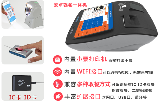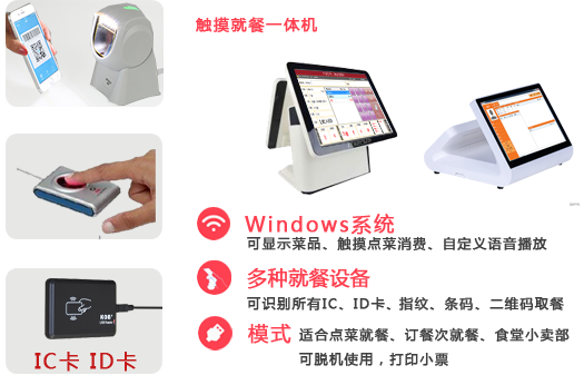 - 支持安卓一体机、手持消费机、小票打印取餐、支持普通电脑